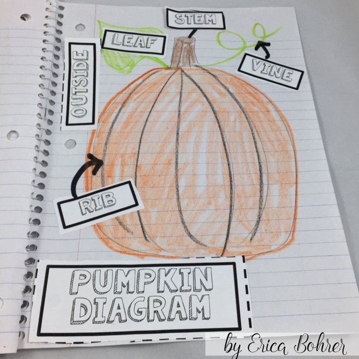 Before we even start learning about pumpkins, we complete a schema chart. The students tell me what they think they know about pumpkins. I write the thinkings down on post-its. As we learn, we move the posts-its to “Yes, We Were Right” or “Oops, We Were Wrong.” The students stop me and tell me when they learn something new about pumpkins, we place that on “Our New Learning.” The “Wonderings” section would be for questions they have like “Are pumpkins a fruit or vegetable?”