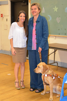This was not Beth’s first visit to our school. However, it was her new seeing-eye dog, Whitney’s first visit. On all of her previous trips to my school, Beth brought Hanni, the narrator of the book. Hanni has since retired and moved away. I know what you’re thinking, but no, she really did retire and lives with a nice couple. Whitney is a two year old yellow lab and golden retriever mix. She was born at The Seeing Eye School in Morristown, NJ.
