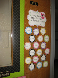 This year’s theme is polka dots. I created new monthly headings (available at Tpt in my Bright Polka Dot Packet {here}). I don’t have students yet, so there aren’t any photographs up. I plan on photographing the students in front of polka dotted fabric or a polka dot shower curtain. I also take individual pictures of each student infront of the backdrop. These photos are used for center grouping, name tags, labels, and their September scrapbook entry.