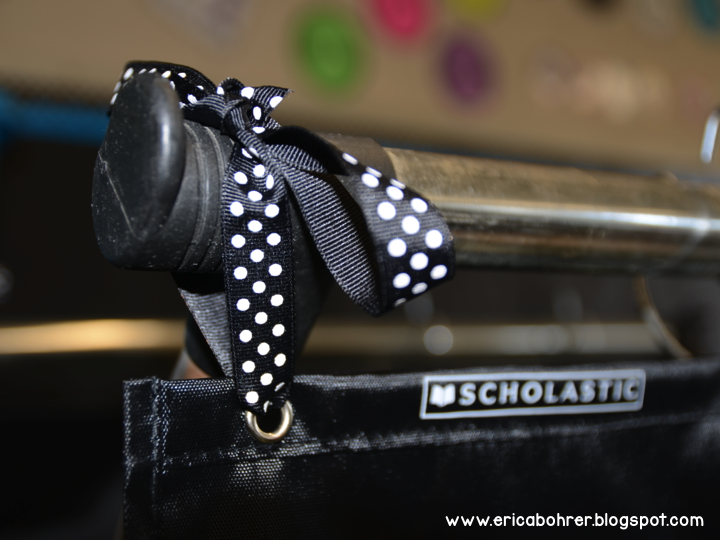 For more info on the drawers, hop over to {THIS} post. I found black pocket charts from Scholastic!! I used ribbon to tie them to the ends of my pocket chart. I did this because 1. It looks pretty. and 2. The pocket chart was wider than my stand.