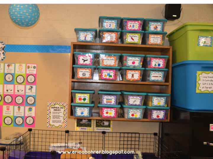 I use the bins above my closets to store my monthly themed read alouds, craft samples, centers, and extra copies.