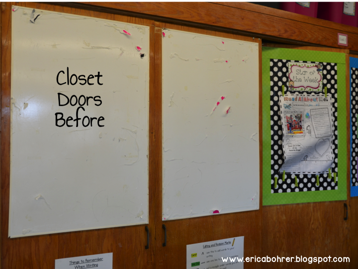 Our closet doors have white boards instead of bulletin boards. So every year, I hot glue wrapping paper to it to create my bulletin boards. I purchased the wrapping paper from Marshall’s. I got the idea to use wrapping paper from Melanie of School Girl Style!