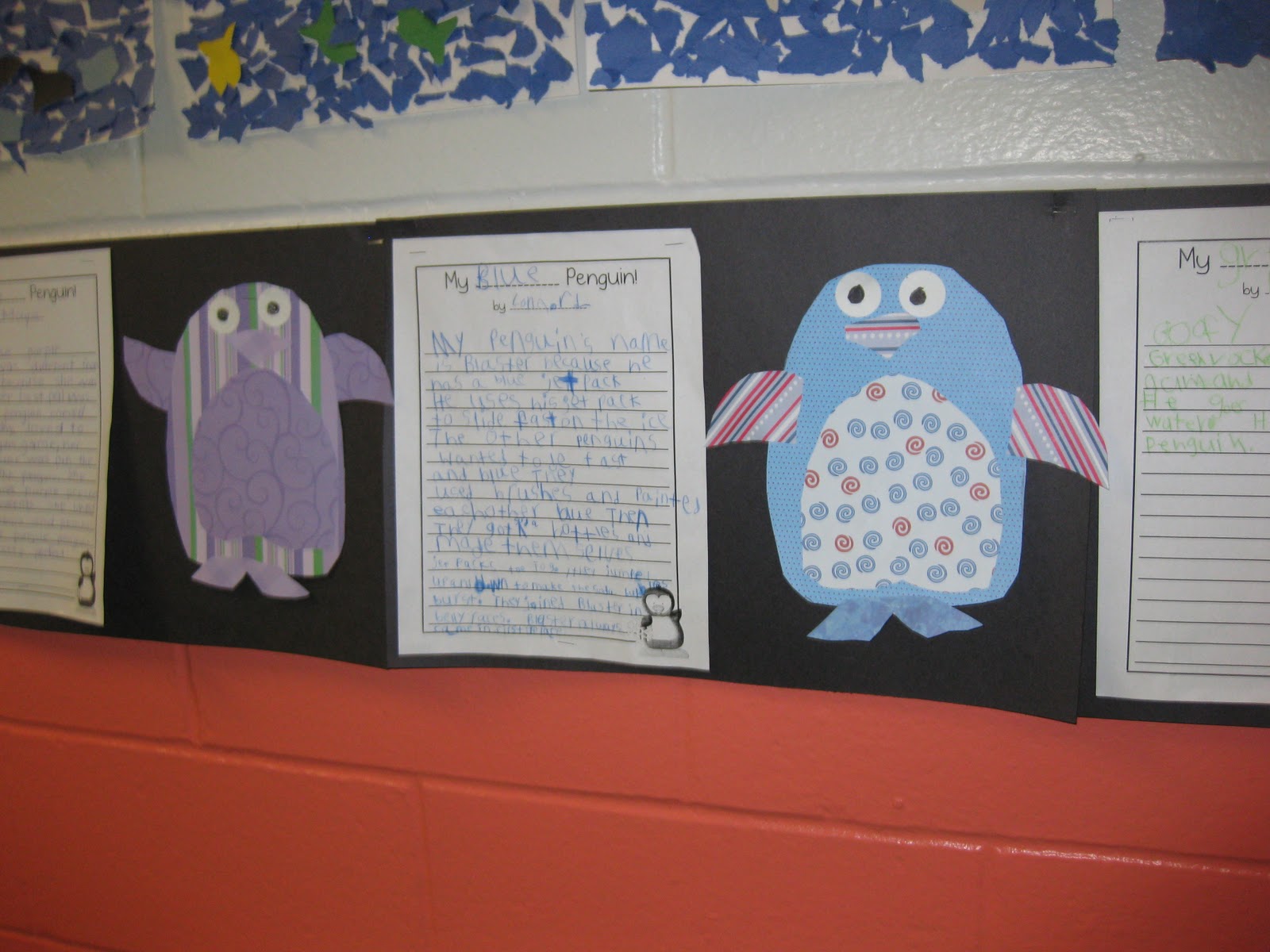 First, I gathered up my scrapbook paper and let the students choose one of four colors. The students either made a pink, purple, blue, or green penguin. After, they created their penguins, they named them using real or made-up names that began with the same letter as the color word. For example, Poppy the Pink Penguin or Blaze the Blue Penguin. Once names were picked, the students worked on creating stories based around their penguins. The top writers were able to incorporate alliteration and have a story with a problem and solution. The middle to bottom writers tended to focus on describing their penguin using alliteration. The end result was an eye-catching hallway display.