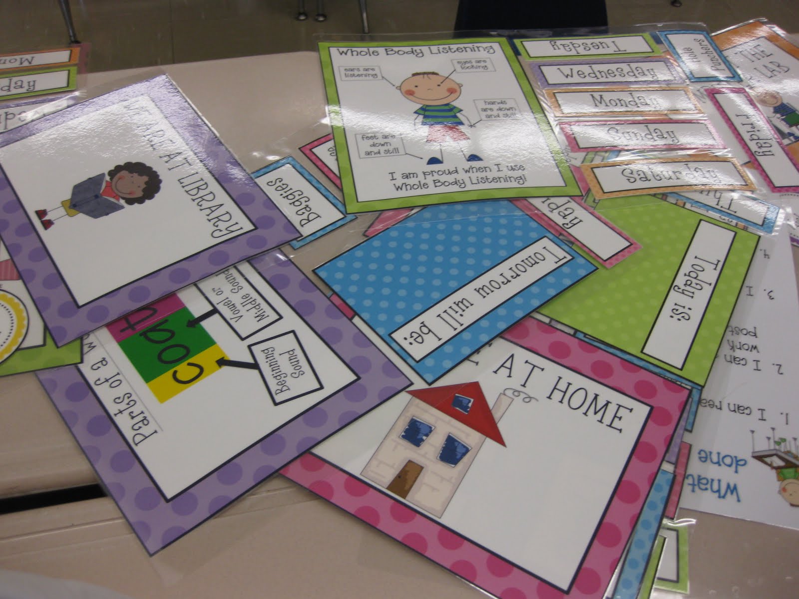 I have been busy creating new labels and signs to go with my new theme. After, I create, I cut and laminate. I have a small laminator at school and a bit larger one at home. Here are some photos of my classroom and of my work in progress: