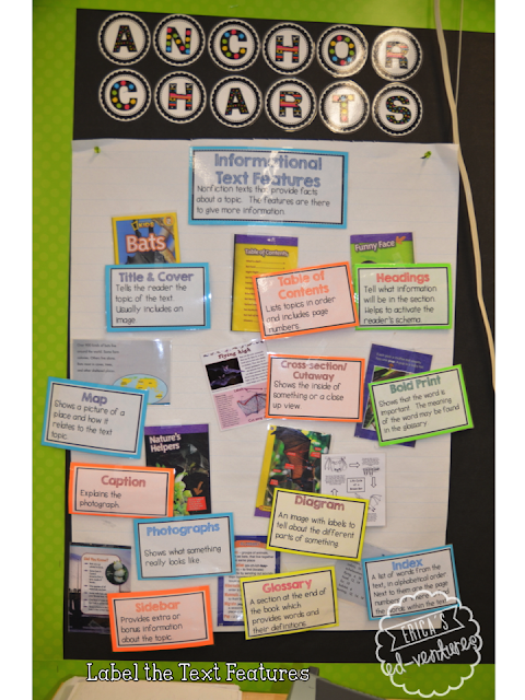Then we focused on informational text features. I plan on doing this next week. I had the students label informational text features. I did this by scanning pages from a couple of bat themed books. I then printed and laminated the scans and taped them to chart paper. Throughout the year, I have been trying to stop and point out text features during read alouds and guided reading. I created text feature definition cards. I mounted them on cardstock and laminated them. Then for a lesson, I read the text feature cards (click here to snag yours for free) and had the students match the cards to the feature. The completed anchor chart is now on display in the classroom for the students to use as a reference.