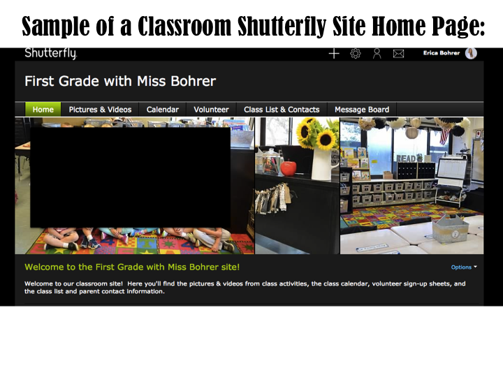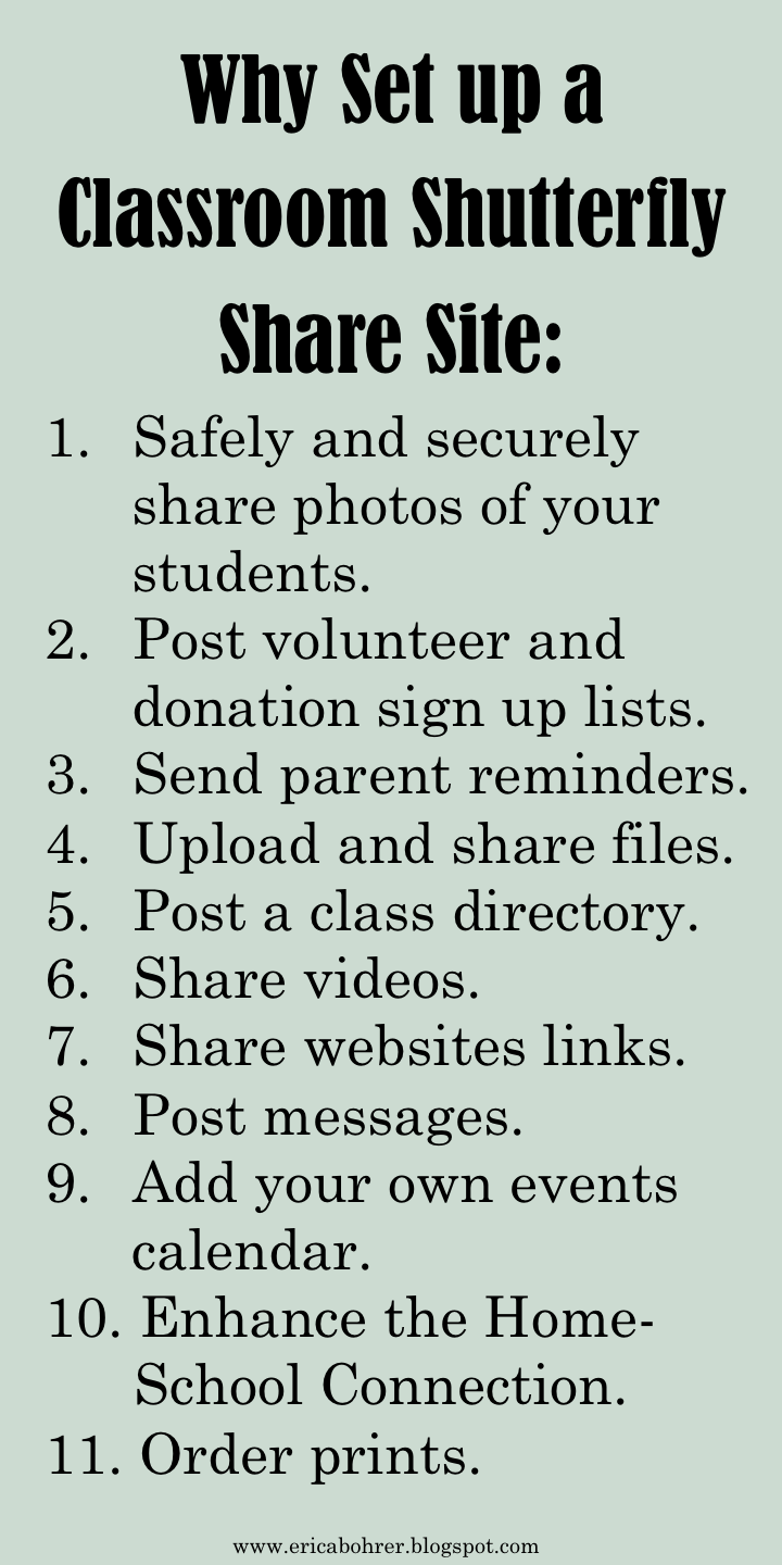 Every school year I set up a secure classroom photo share website. I have always used Shutterfly. They have this super easy to set up template for classroom share sites. It is really so fast to set up and it is a closed, secure way to share photos and more.