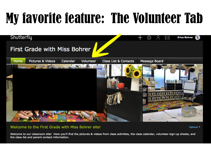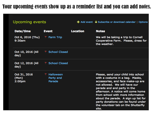This is my favorite feature of the Shutterfly site. You can create volunteer lists for events or donations needed. Parents put their name next to an item or to volunteer to come in to help for an event. The site automatically sends the parent a reminder email before the event or before the donation is needed. Instead of passing around a sign up list for class parties at Meet the Teacher Night, I post the party sign up list on the Shutterfly site.