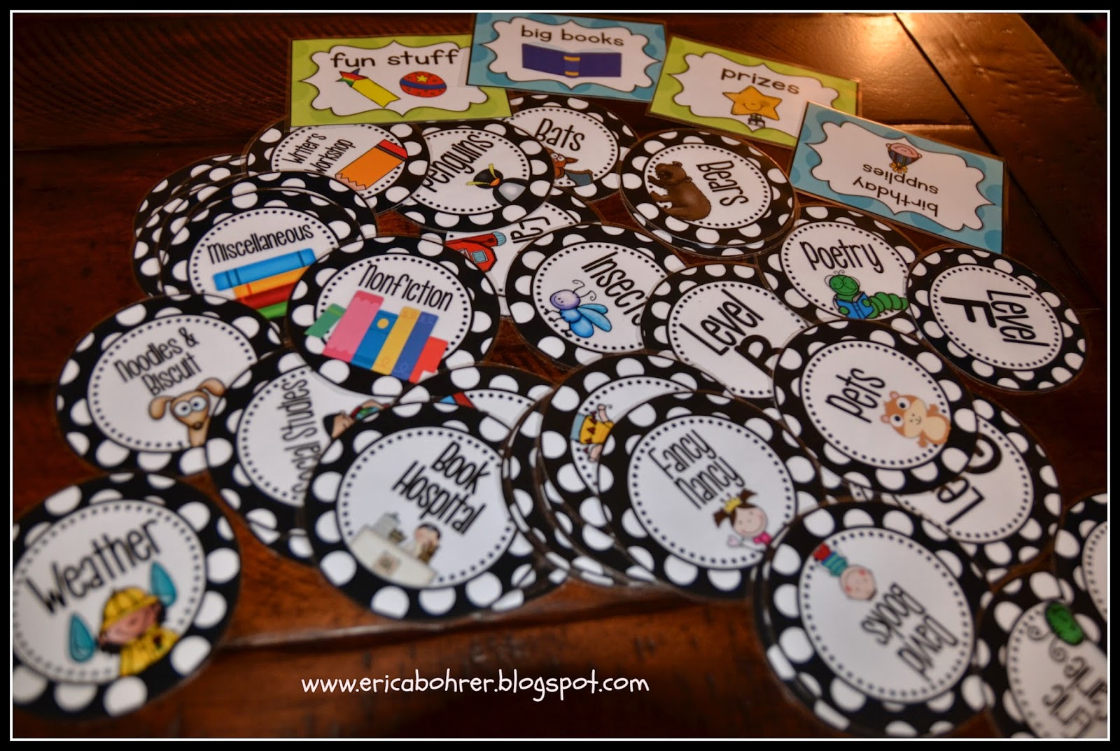 I label everything in the room, I always include a visual cue. This creates a print rich environment and fosters independence in my students. I can just ask a student to go grab me some extra staples and they know exactly where to look. My classroom library has labels on the outside of bins and mini-labels on the back of the books on the inside. Again, this fosters independence and keeps the classroom neat!