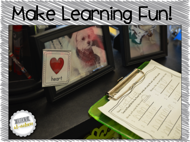 Last year, my students really had the wiggles! I needed to create more center activities that involved movement. So I came up with a ton of Search/Read/Write the Room Activities. For the beginning of the year, I have the pictures match the word and then the students sort the word into one of two categories. In the picture above the student is going to decided if “heart” begins with “initial consonant H” or ends in “-ap. ” He/she will then record the word in the appropriate column.
