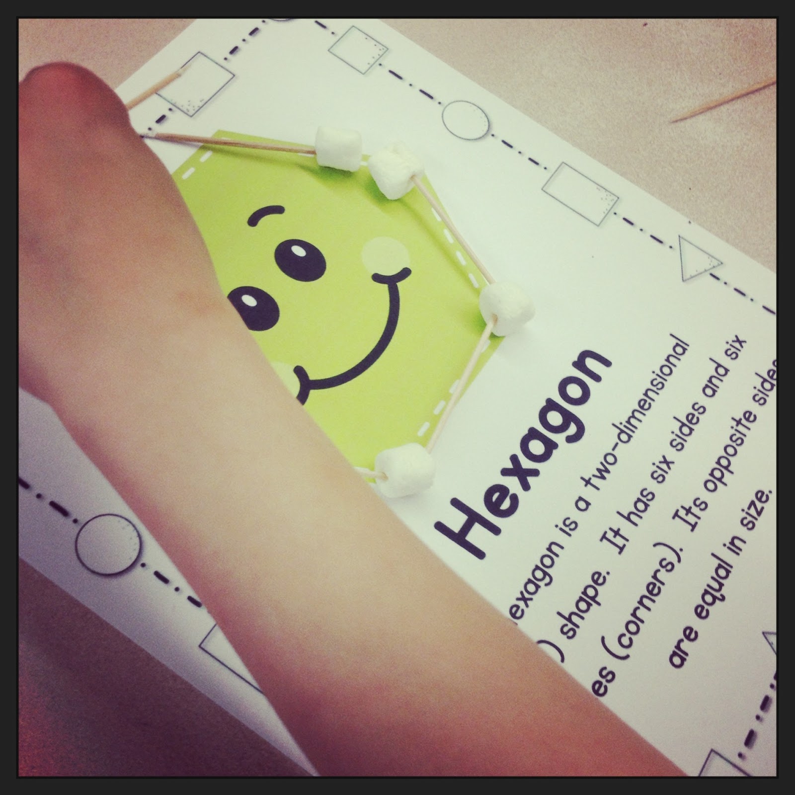 Toothpick Shapes – The students use toothpicks and marshmallows to build shapes. They use my plane shape posters as a guide. They then place a tag on their toothpick shape and label what the shape is, how many vertices it has, and how many sides.